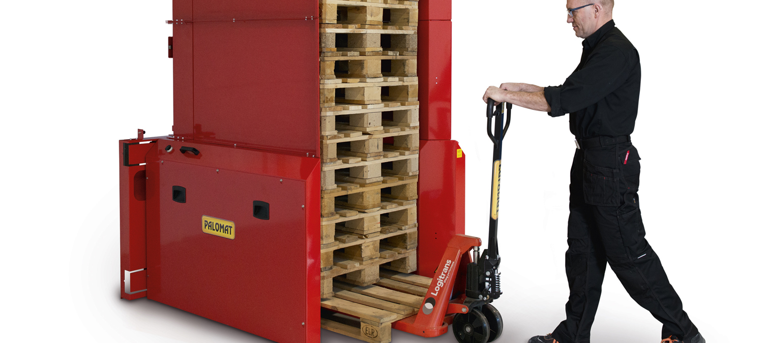 The PALOMAT® Adjustable automatically stacks and de-stacks empty Euro or industrial pallets individually at floor level. The pallets are handled in an easy and user-friendly way with, say, a pallet truck, electric pallet stacker or forklift truck. Employees are spared the inappropriate manual heavy lifting of pallets, the work environment is improved and the handling of pallets is made more effective.