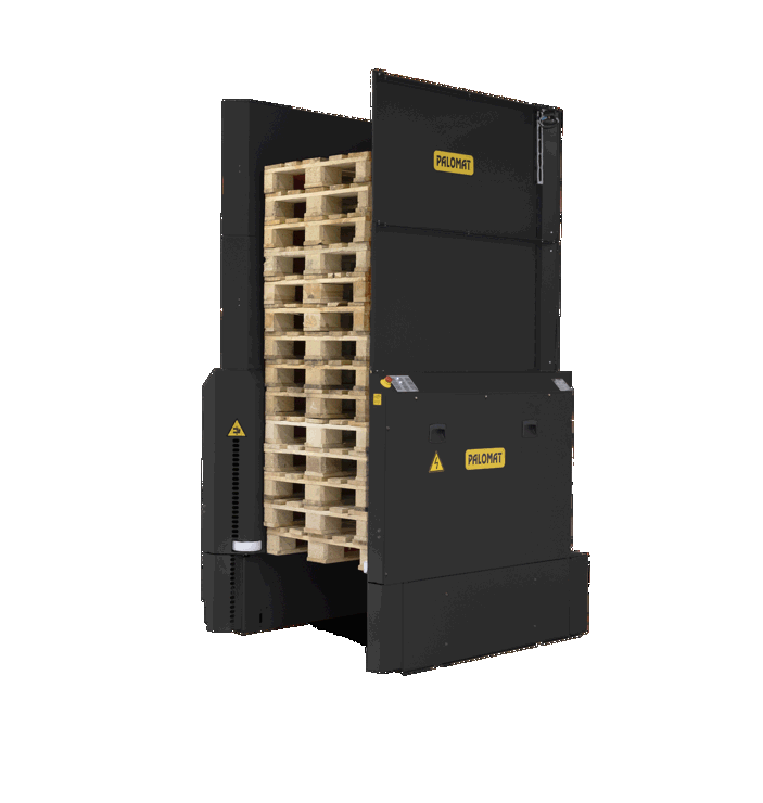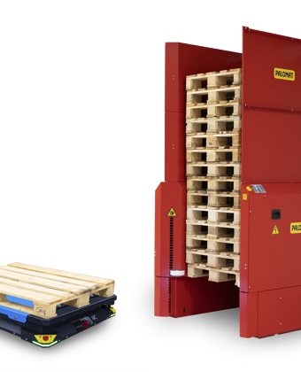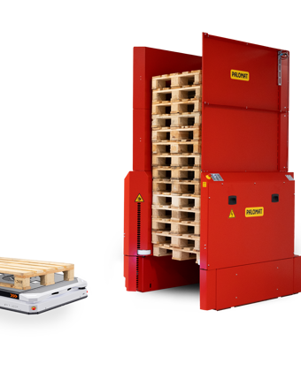 The pallet magazine automatically stacks and destacks the pallets on GoPal, and serves as a pallet buffer and docking station that is always automatically running