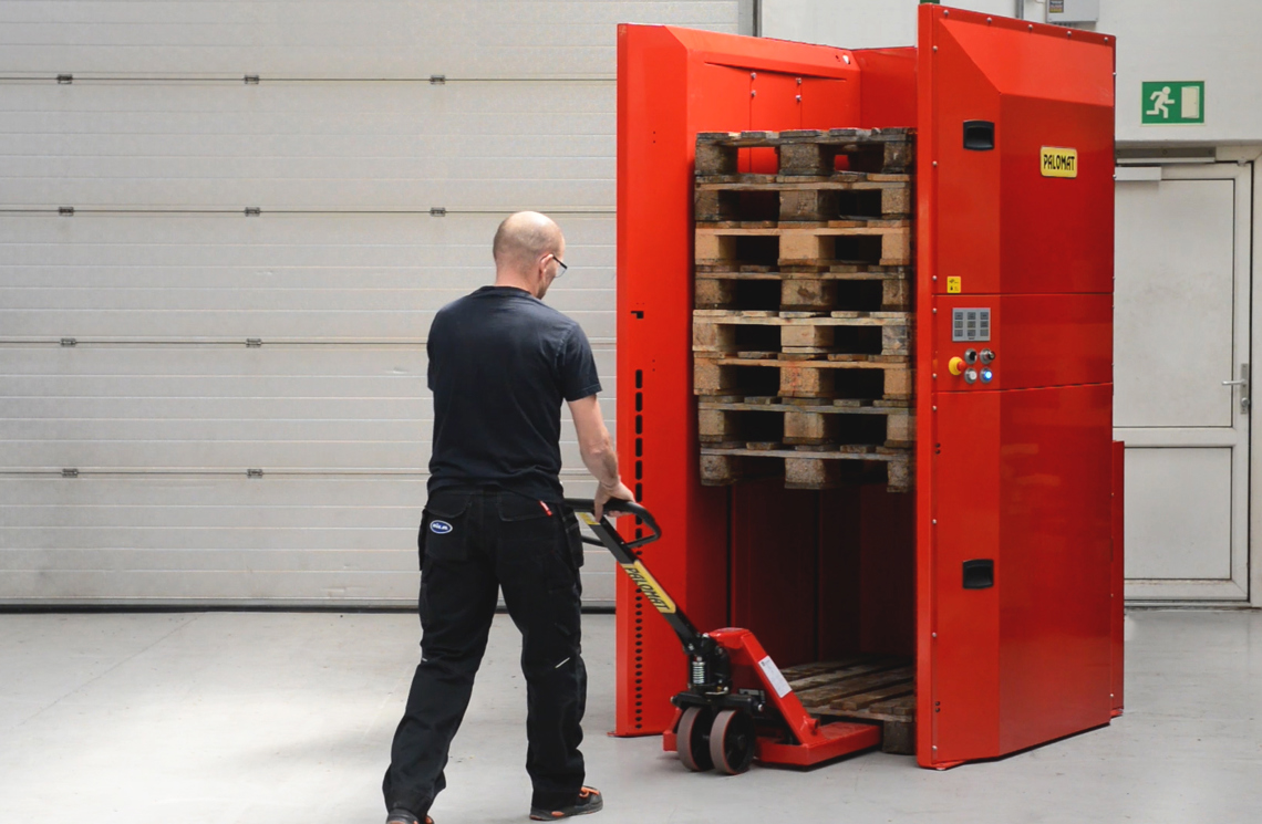 The machine can handle all 4-way pallets made of wood, plastic, and metal regardless of their dimensions