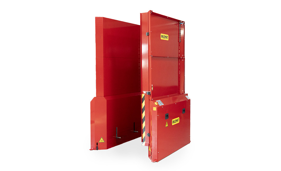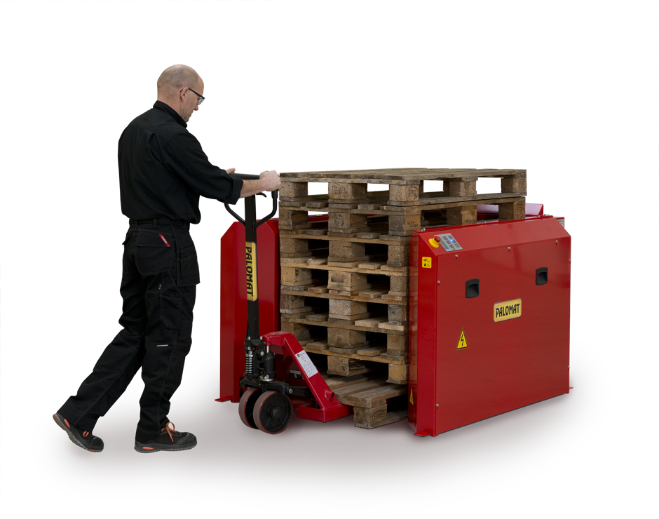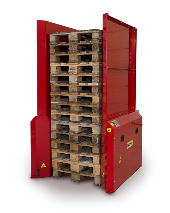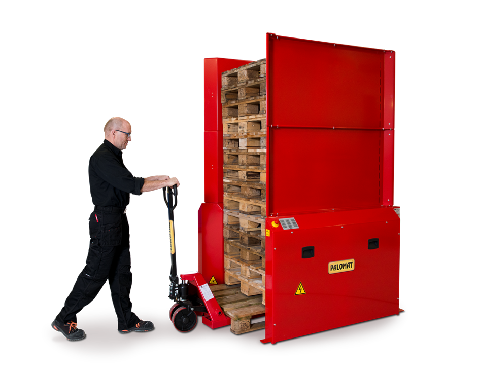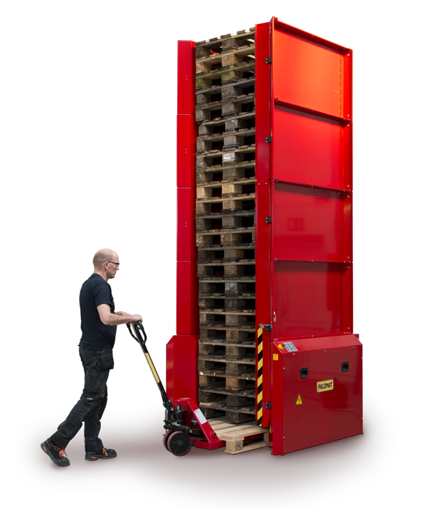 The PALOMAT Flexomatic is designed for automatic pallet stacking and destacking. The user can insert or remove pallets using a stacking truck or a fork lift truck, all of which can be carried out at floor level. The PALOMAT Flexomatic utilises photo sensors to detect the pallets, which are then automatically stacked or destacked one by one.